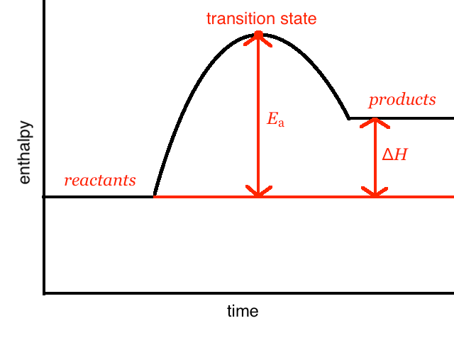 In the diagram above we can see that the reaction is endothermic (absorbs energy) because is positive, i.e. the products have more energy than the reactants, meaning energy has been absorbed from the surroundings.